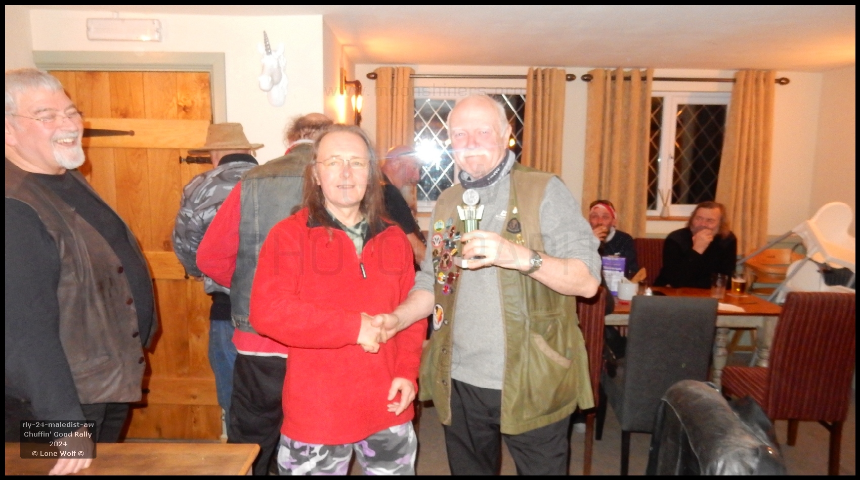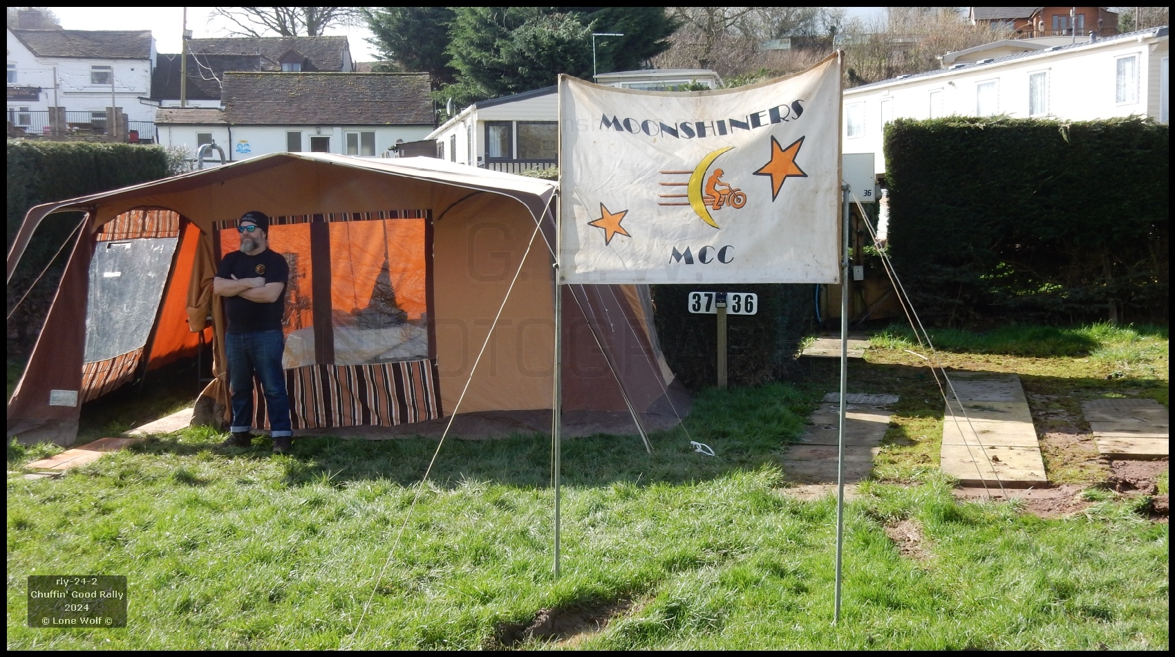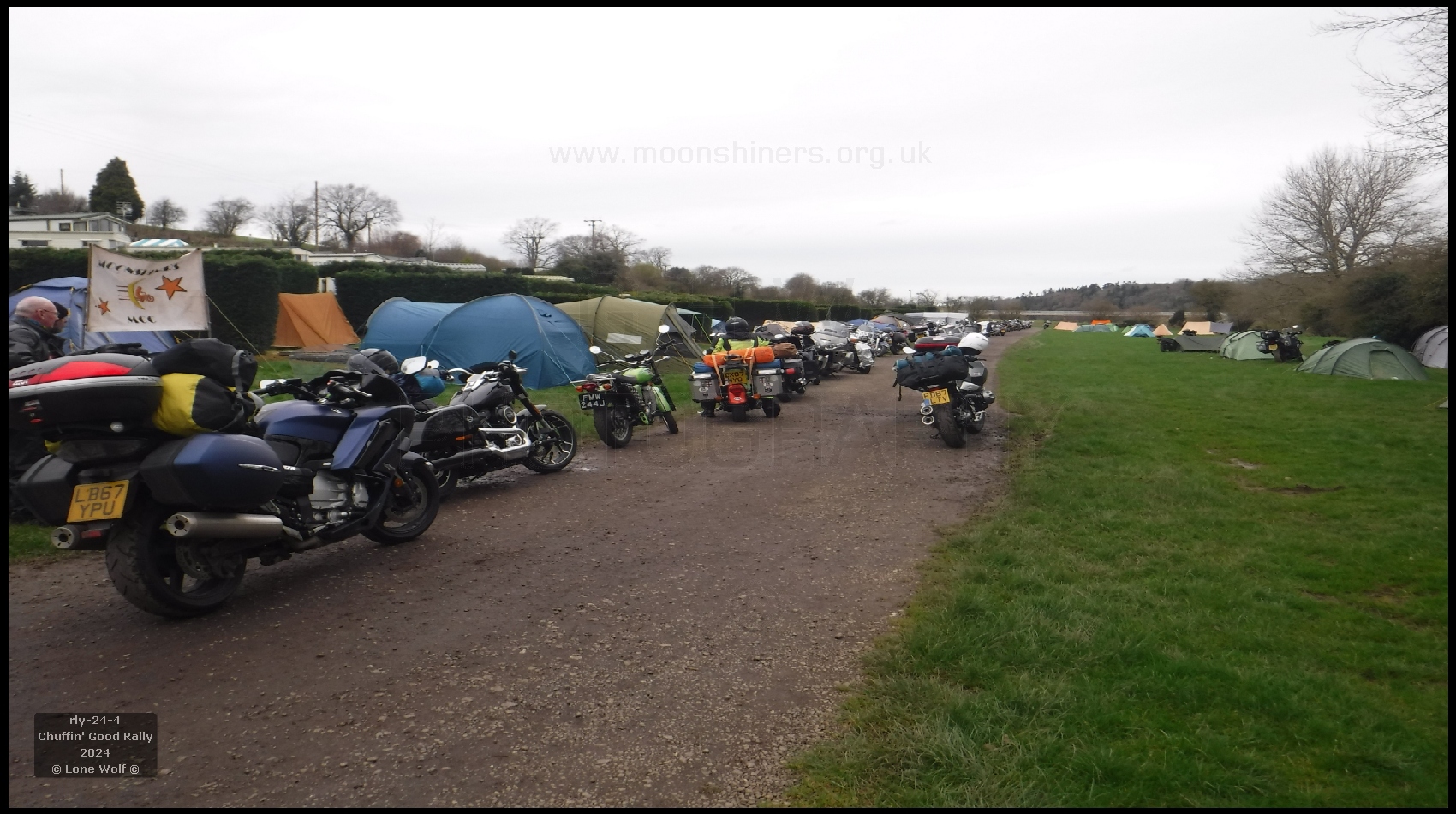 Before long the tent was up and the kettle was on. We did have a bit of a niggle earlier on when we found that the boards we use as table tops were no longer available, so it was half a dozen scaffold boards to the rescue. We'd also made a few more "duck boards" to go on the floor 'cos we knew what that mud was like. Weather-wise we did OK with only one heavy shower all day Friday. Quite a few folks had turned up - things were looking good. Having got all that done, it was off to the pub for dinner. The pub meals were certainly on the large side, with quite a few folks admitting defeat, unable to finish it all. Once again the pub was serving "Moonshiners Chuffin' Good Ale" - which I must say was a most excellent pint.